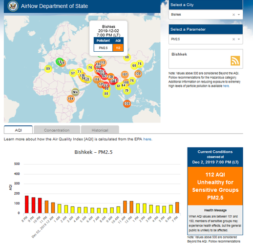 Посольство США в Кыргызстане также установило датчик. Он показывает индекс качества воздуха в режиме онлайн. Информация обновляется ежечасно.