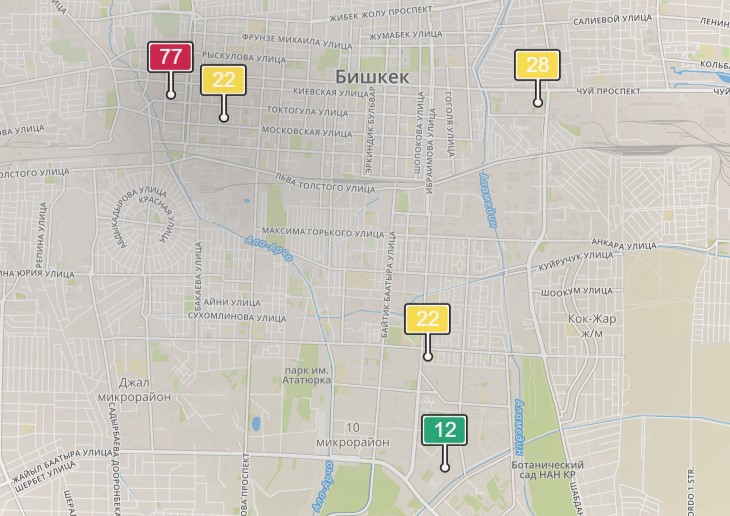 • в районе улиц Бейшеналиевой/Токтогула. Уровень загрязнения превышен в 2,54 раза: PM2.5 среднесуточный — 89 мкг/м³, на момент измерения — 77 мкг/м³;