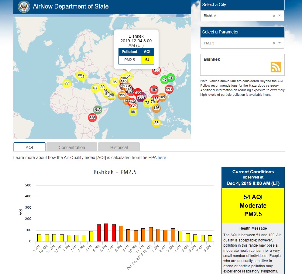 Посольство США в Кыргызстане также установило датчик. Он показывает индекс качества воздуха в режиме онлайн. Информация обновляется ежечасно.