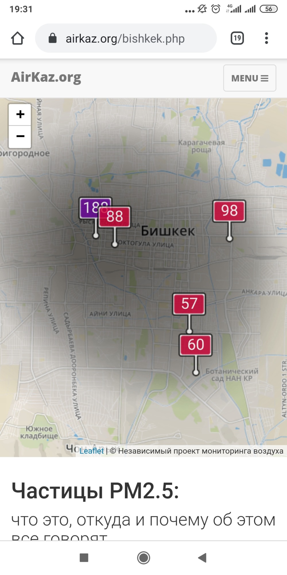 • в районе улиц Бейшеналиевой/Токтогула. Уровень загрязнения превышен в 2,11 раза: PM2.5 среднесуточный — 74 мкг/м³, на момент измерения — 188 мкг/м³;