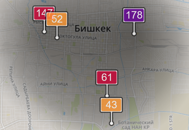 - в районе улиц Бейшеналиевой/Токтогула. Уровень загрязнения превышен в 9 раз: PM2.5 среднесуточный — 316 мкг/м³, на момент измерения — 181 мкг/м³;