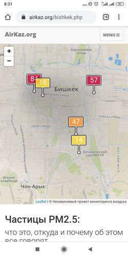 - в районе улиц Бейшеналиевой/Токтогула. Уровень загрязнения превышен в 3,22 раза: PM2.5 среднесуточный — 113 мкг/м³, на момент измерения — 84 мкг/м³;