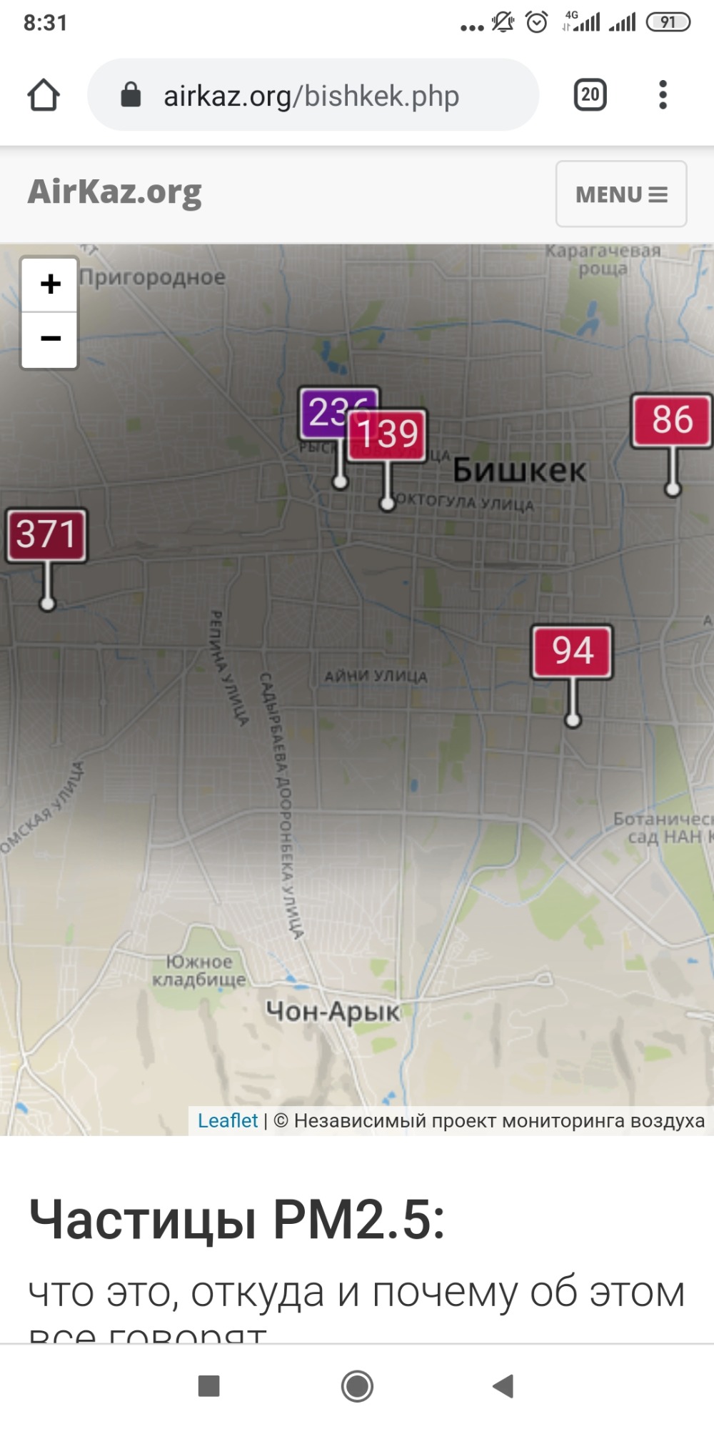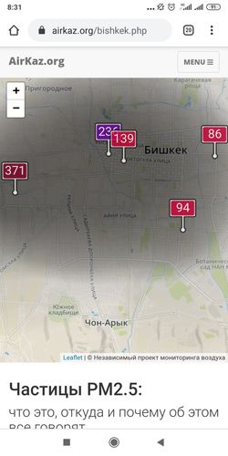 • жилмассив «Ак-Орго». Уровень загрязнения превышен в 6,65 раза: PM2.5 среднесуточный — 233 мкг/м³, на момент измерения — 371 мкг/м³;