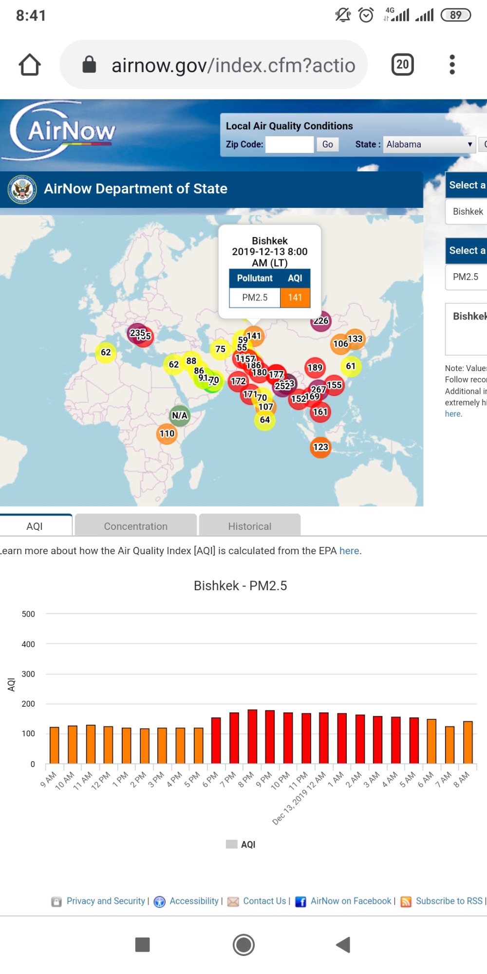 Посольство США в Кыргызстане также установило датчик. Он показывает индекс качества воздуха в режиме онлайн. Информация обновляется ежечасно.
