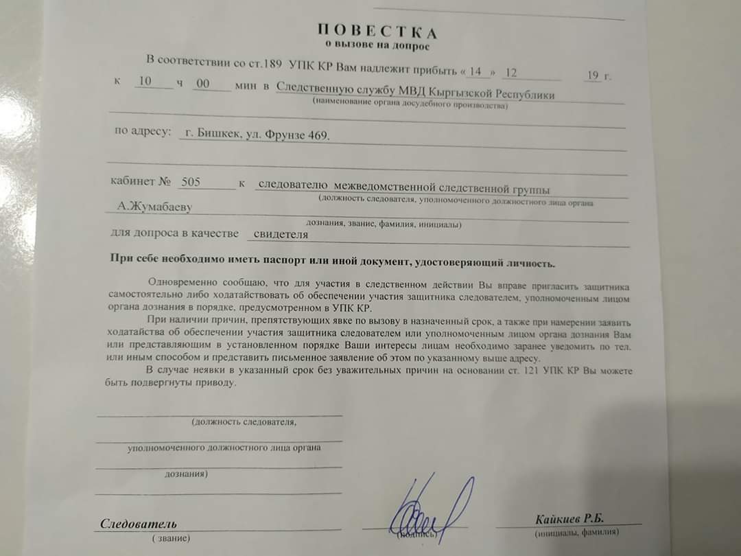 В документе указывается, что Кундуз Жолдубаева вызвана на допрос в качестве свидетеля.