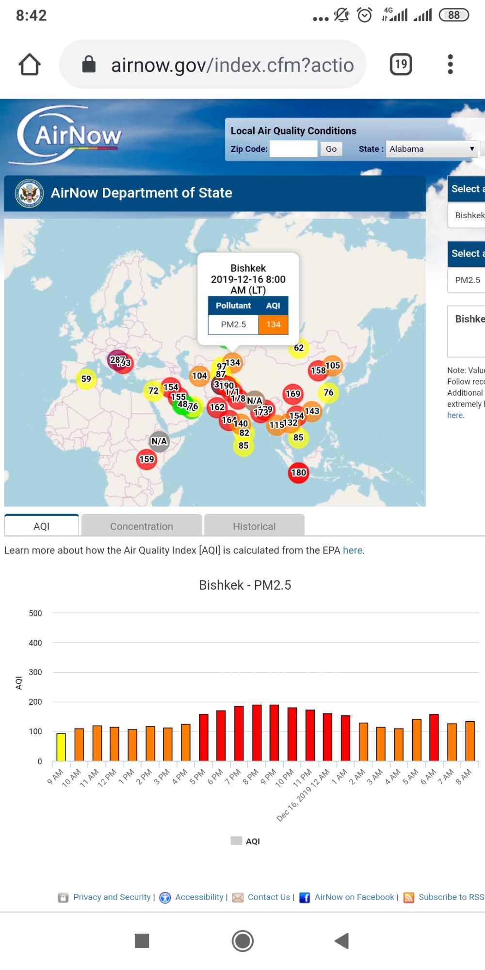 Посольство США в Кыргызстане также установило датчик. Он показывает индекс качества воздуха в режиме онлайн. Информация обновляется ежечасно.