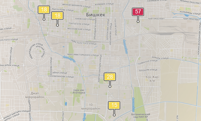 - в районе улиц Бейшеналиевой/Токтогула. Уровень загрязнения превышен в 1,14 раза: PM2.5 среднесуточный — 40 мкг/м³, на момент измерения — 18 мкг/м³;