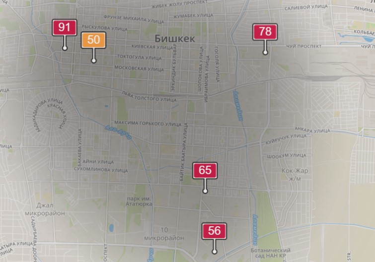 - в районе улиц Бейшеналиевой/Токтогула. Уровень загрязнения превышен в 2,8 раза: PM2.5 среднесуточный — 98 мкг/м³, на момент измерения — 91 мкг/м³;