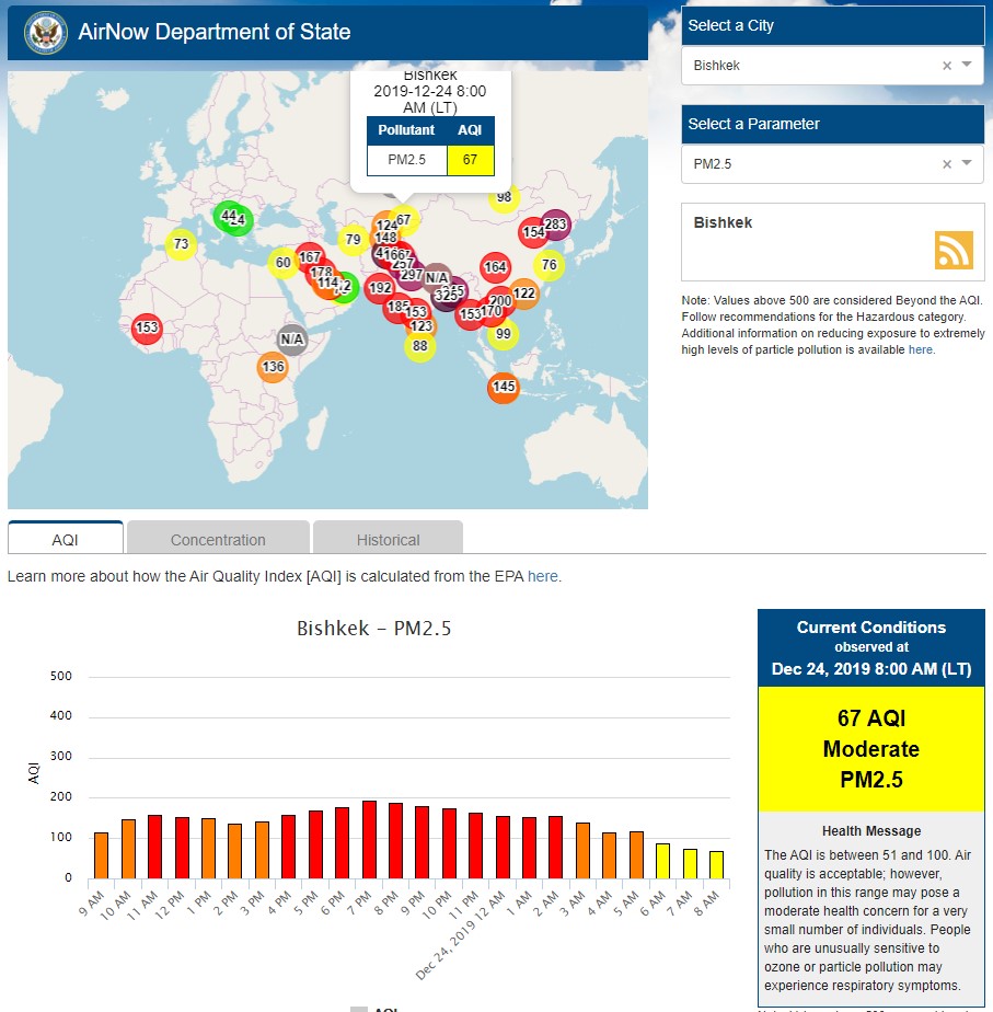 Посольство США в Кыргызстане также установило датчик. Он показывает индекс качества воздуха в режиме онлайн. Информация обновляется ежечасно.