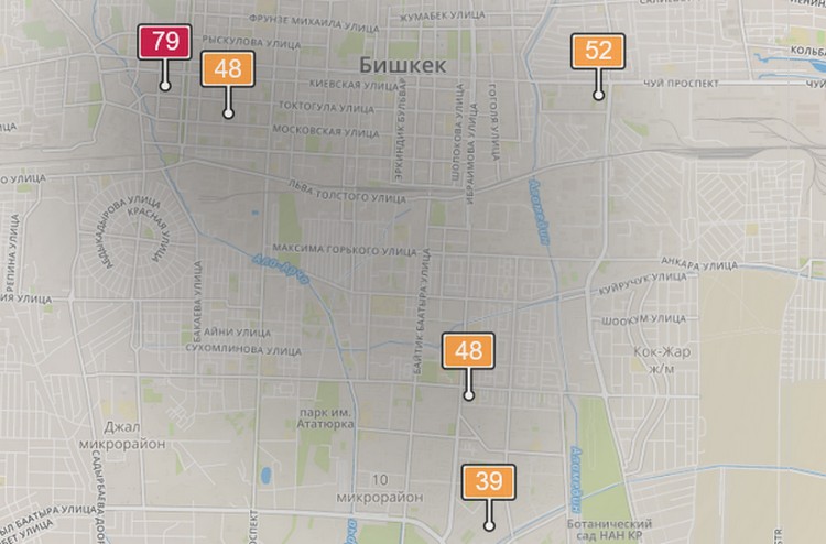 - в районе улиц Бейшеналиевой/Токтогула. Уровень загрязнения превышен в 7,11 раза: PM2.5 среднесуточный — 249 мкг/м³, на момент измерения — 79 мкг/м³;