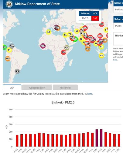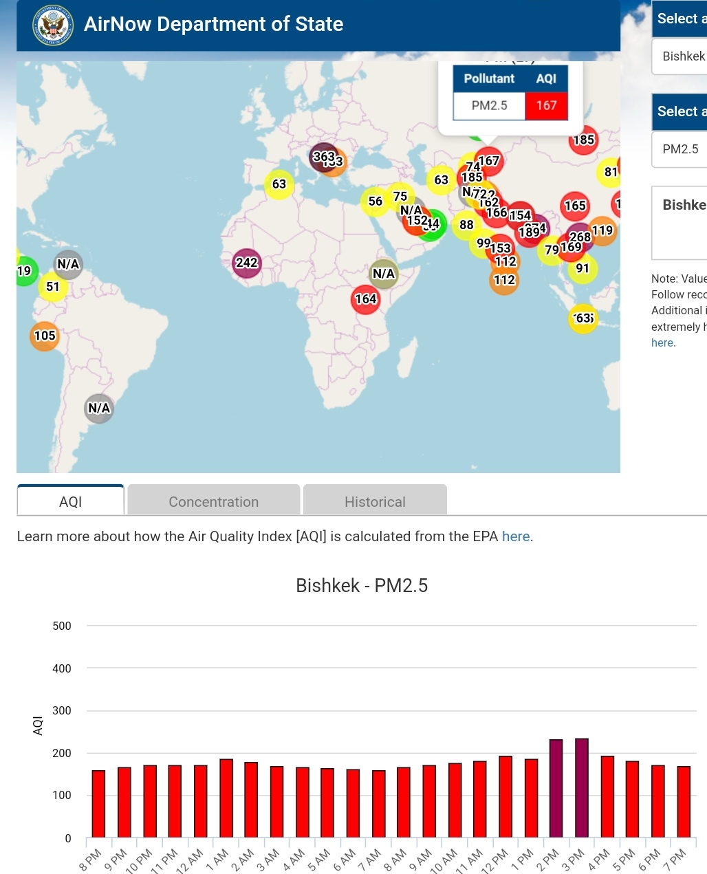 Посольство США в Кыргызстане также установило датчик. Он показывает индекс качества воздуха в режиме онлайн. Информация обновляется ежечасно.
