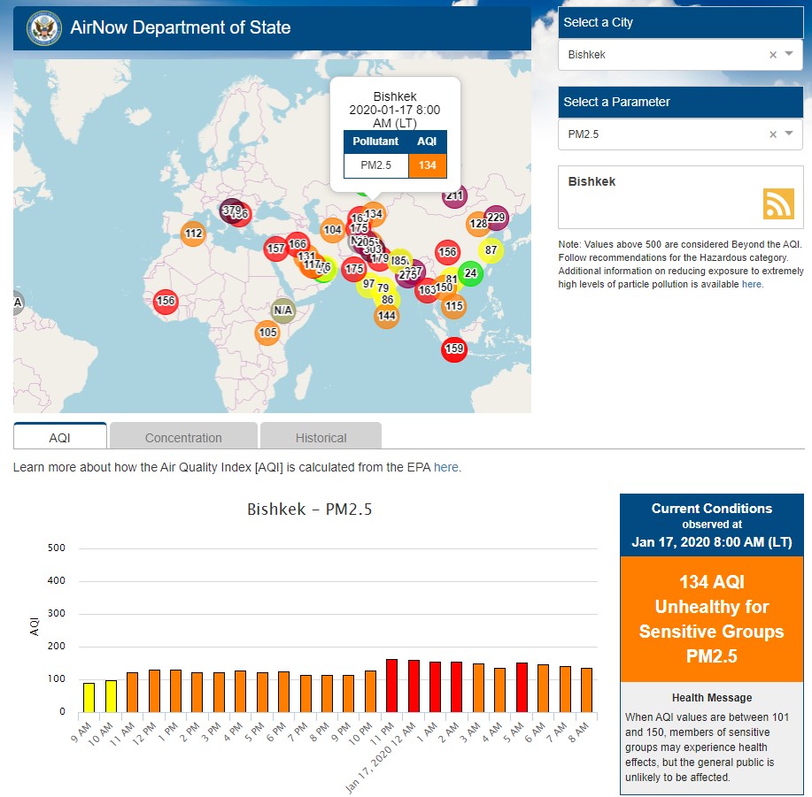 Посольство США в Кыргызстане также установило датчик. Он показывает индекс качества воздуха в режиме онлайн. Информация обновляется ежечасно.
