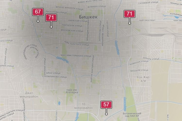 • в районе улиц Бейшеналиевой/Токтогула. Уровень загрязнения превышен в 1,97 раза: PM2.5 среднесуточный — 69 мкг/м³, на момент измерения — 67 мкг/м³;