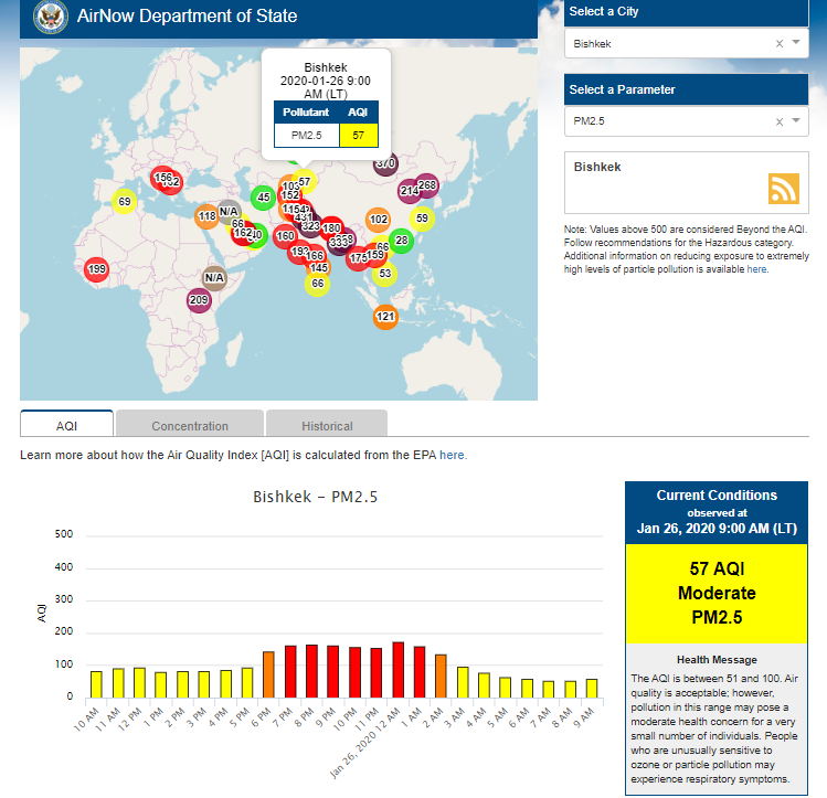Посольство США в Кыргызстане также установило датчик. Он показывает индекс качества воздуха в режиме онлайн. Информация обновляется ежечасно.