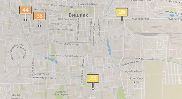 • в районе улиц Бейшеналиевой/Токтогула. Уровень загрязнения превышен в два раза: PM2.5 среднесуточный — 71 мкг/м³, на момент измерения — 44 мкг/м³;