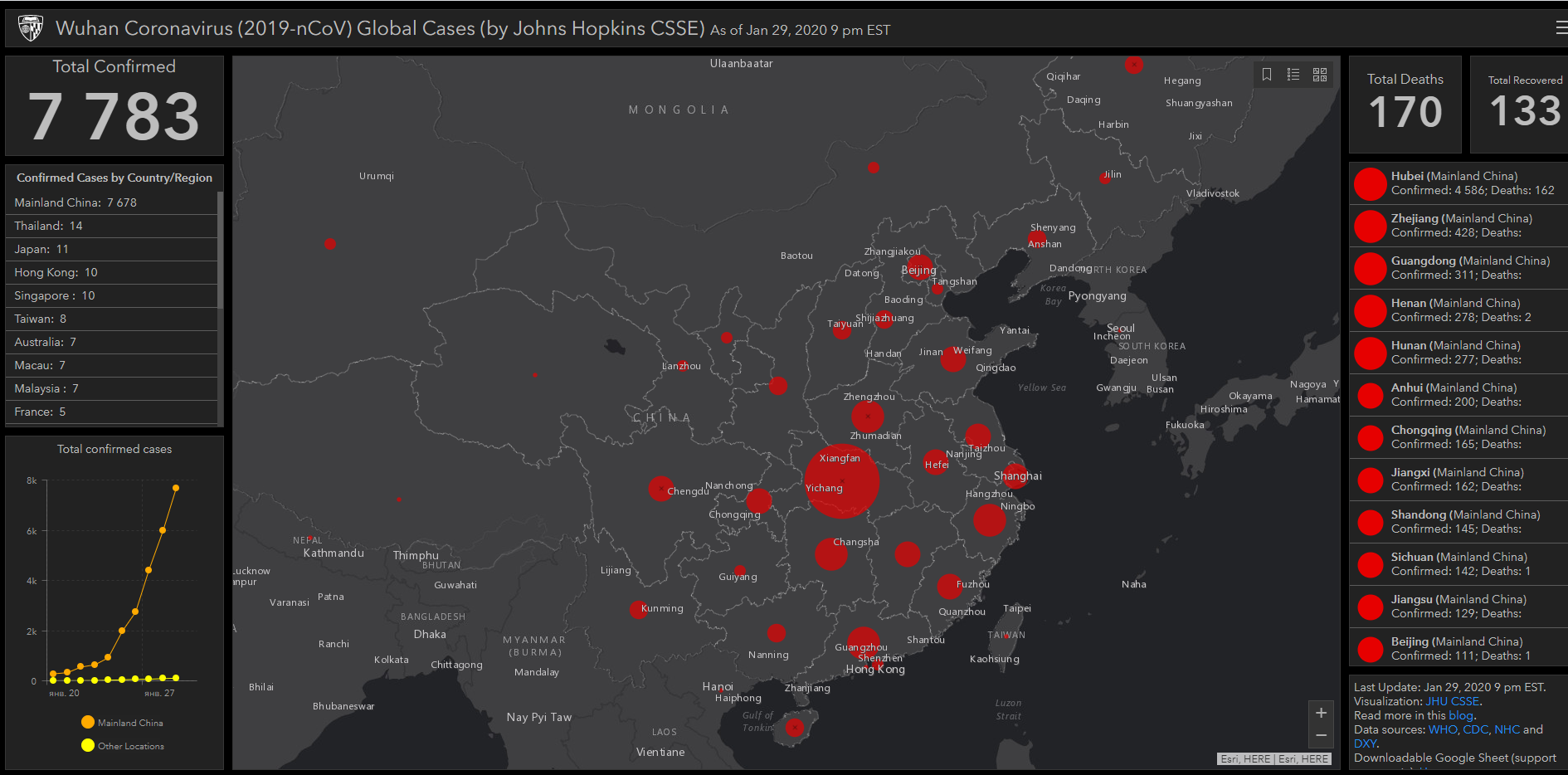 Число погибших от нового коронавируса в Китае выросло до 170 человек. Об этом свидетельствуют данные онлайн-карты, разработанной учеными.
