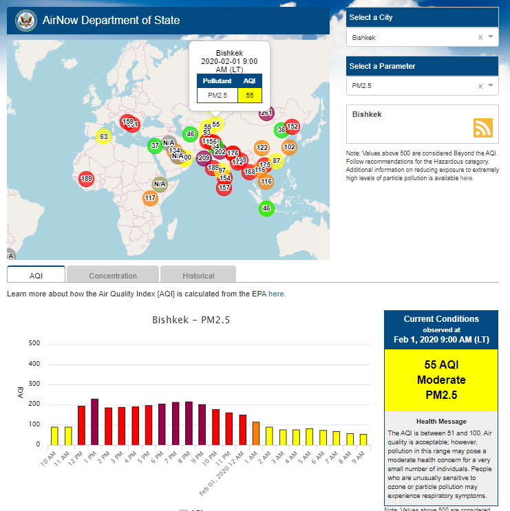 Посольство США в Кыргызстане также установило датчик. Он показывает индекс качества воздуха в режиме онлайн. Информация обновляется ежечасно.