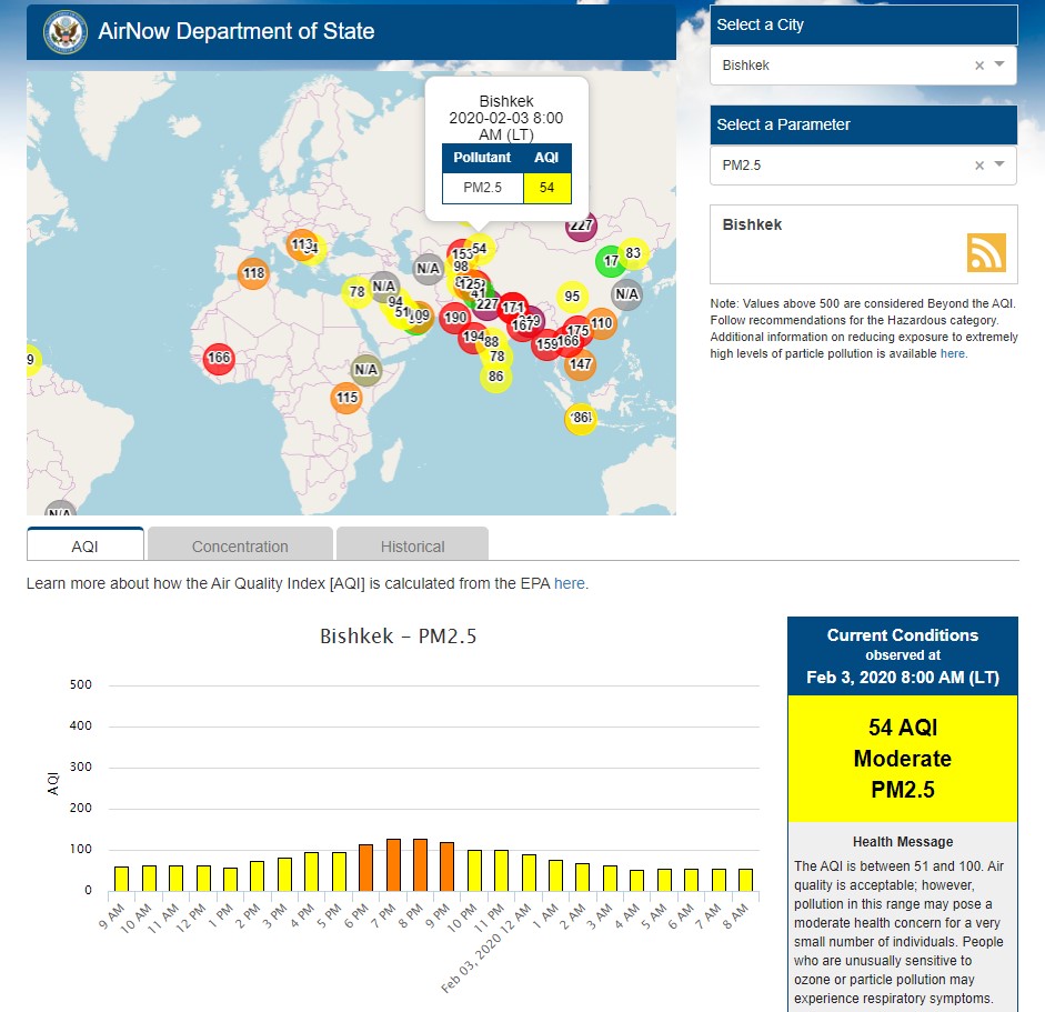 Посольство США в Кыргызстане также установило датчик. Он показывает индекс качества воздуха в режиме онлайн. Информация обновляется ежечасно.