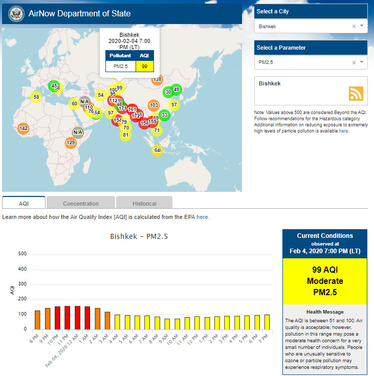 Посольство США в Кыргызстане также установило датчик. Он показывает индекс качества воздуха в режиме онлайн. Информация обновляется ежечасно.