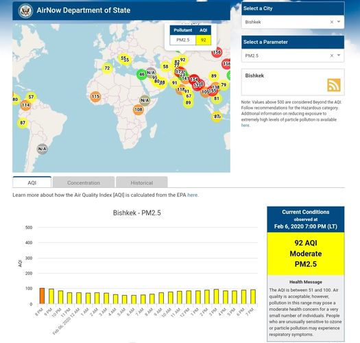 Посольство США в Кыргызстане также установило датчик. Он показывает индекс качества воздуха в режиме онлайн. Информация обновляется ежечасно.