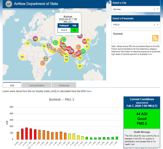 Посольство США в Кыргызстане также установило датчик. Он показывает индекс качества воздуха в режиме онлайн. Информация обновляется ежечасно.
