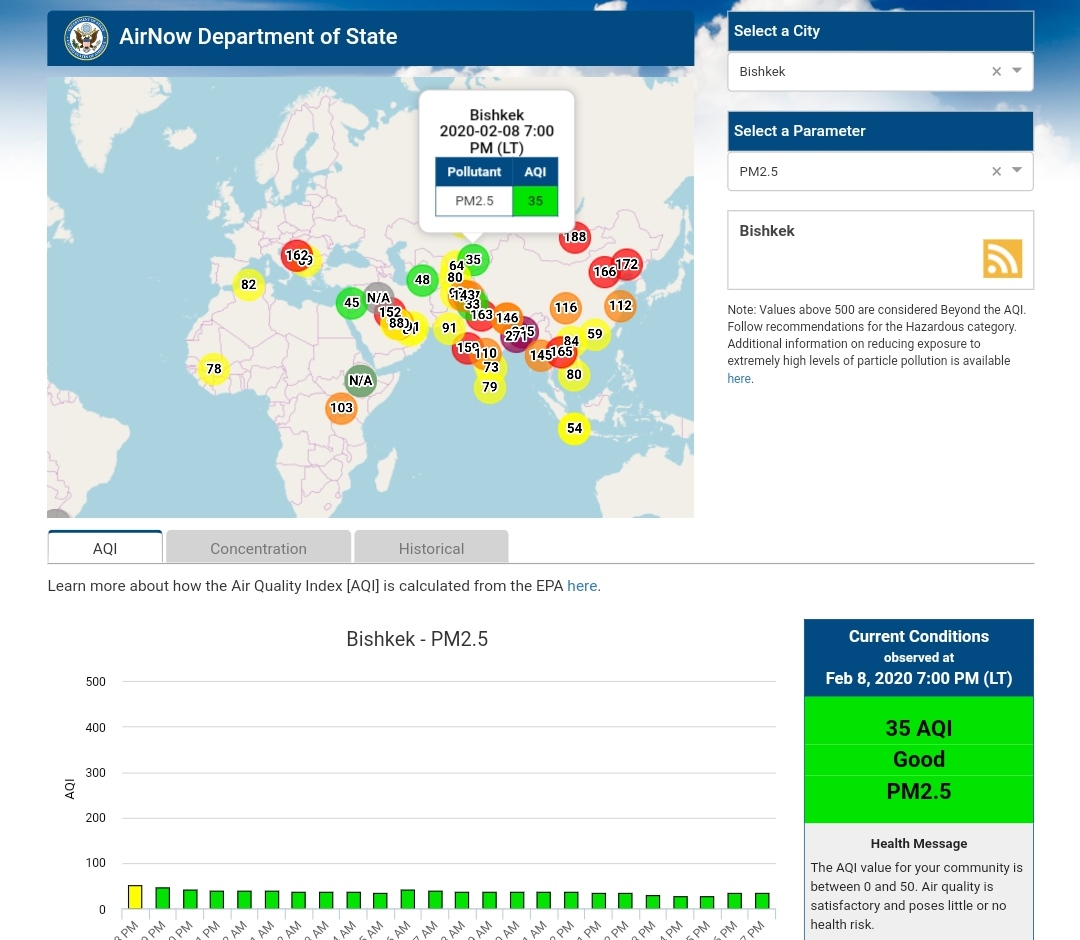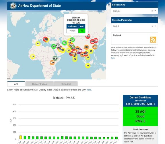 Посольство США в Кыргызстане также установило датчик. Он показывает индекс качества воздуха в режиме онлайн. Информация обновляется ежечасно.