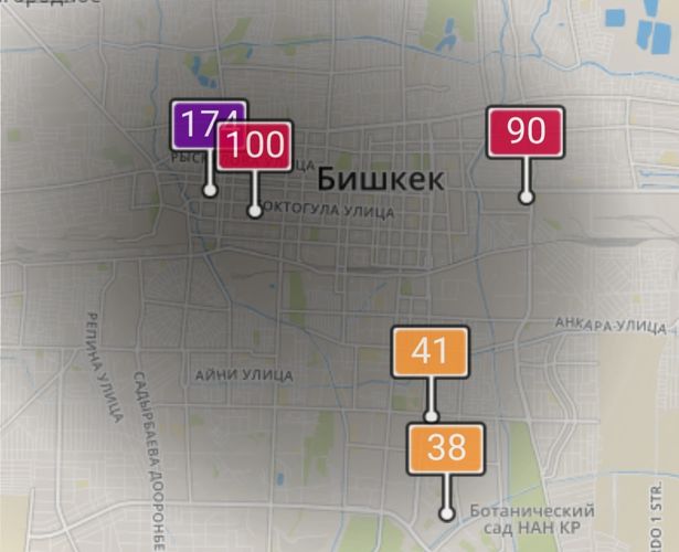 - в районе улиц Бейшеналиевой/Токтогула. Уровень загрязнения превышен в 2 раза: PM2.5 среднесуточный — 70 мкг/м³, на момент измерения — 174 мкг/м³;