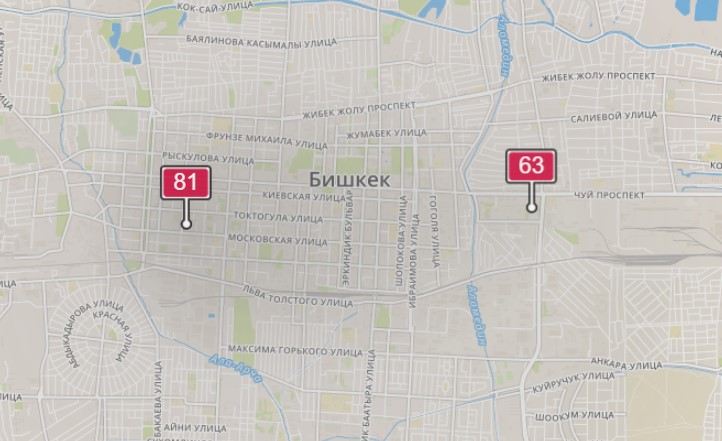 - в районе улиц Московской/Уметалиева. Уровень загрязнения превышен в 1,29 раза: PM2.5 среднесуточный — 45 мкг/м³, на момент измерения — 81 мкг/м³;