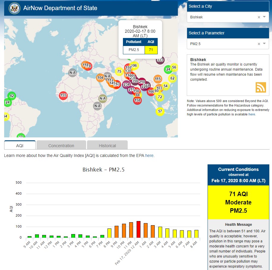 Посольство США в Кыргызстане также установило датчик. Он показывает индекс качества воздуха в режиме онлайн.