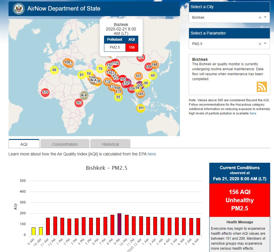 Посольство США в Кыргызстане также установило датчик. Он показывает индекс качества воздуха в режиме онлайн. Информация обновляется ежечасно.