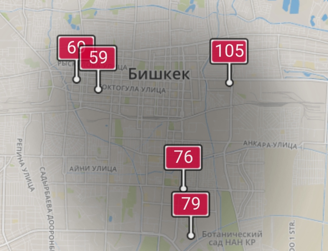 - в районе улиц Бейшеналиевой/Токтогула. Уровень загрязнения превышен в 1,37 раза: PM2.5 среднесуточный — 48 мкг/м³, на момент измерения — 69 мкг/м³;