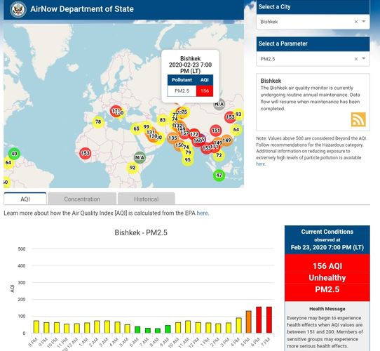 Посольство США в Кыргызстане также установило датчик. Он показывает индекс качества воздуха в режиме онлайн. Информация обновляется ежечасно.