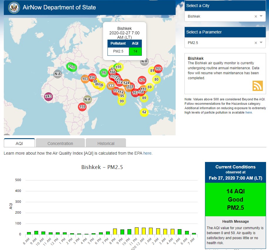 Посольство США в Кыргызстане также установило датчик. Он показывает индекс качества воздуха в режиме онлайн. Информация обновляется ежечасно.
