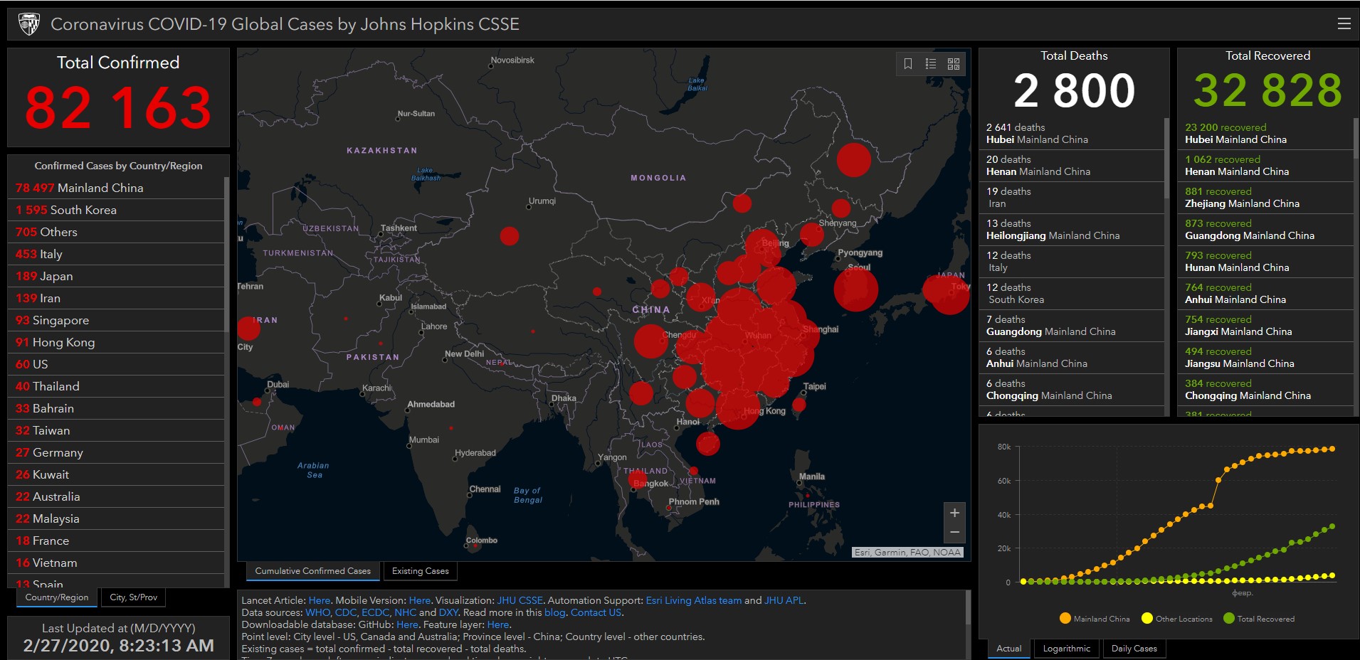Число людей, которые умерли от нового коронавируса, достигло 2 тысяч 800 человек. Об этом свидетельствуют данные онлайн-карты, разработанной учеными.