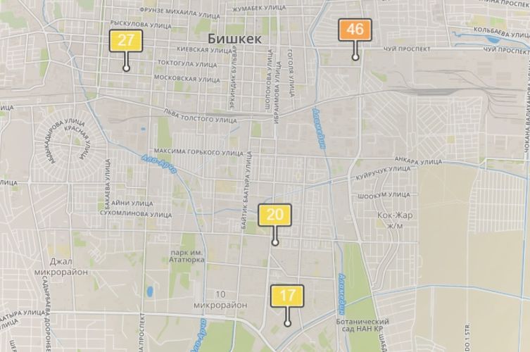 По нормам ВОЗ среднегодовой уровень РМ2.5 должен составлять не больше 10 мкг/м³, а среднесуточный — не больше 25 мкг/м³. В национальном законодательстве КР — 35 мкг/м³. Именно он взят для расчетов. Разовая допустимая концентрация, по данным «МувГрин», установленная в национальном законодательстве, — 160 мкг/м³.