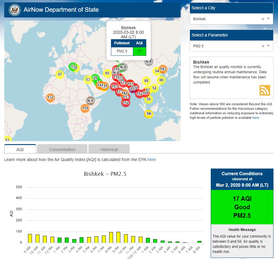 Посольство США в Кыргызстане также установило датчик. Он показывает индекс качества воздуха в режиме онлайн. Информация обновляется ежечасно.