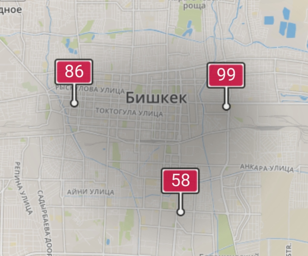 - в районе улиц Бейшеналиевой/Токтогула. Уровень загрязнения превышен в 1,77 раза: PM2.5 среднесуточный — 62 мкг/м³, на момент измерения — 86 мкг/м³;