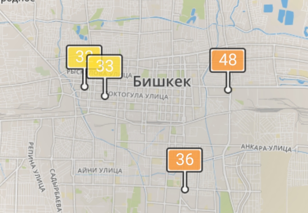 - в районе улиц Бейшеналиевой/Токтогула. Уровень загрязнения превышен в 1,4 раза: PM2.5 среднесуточный — 48 мкг/м³, на момент измерения — 32 мкг/м³;