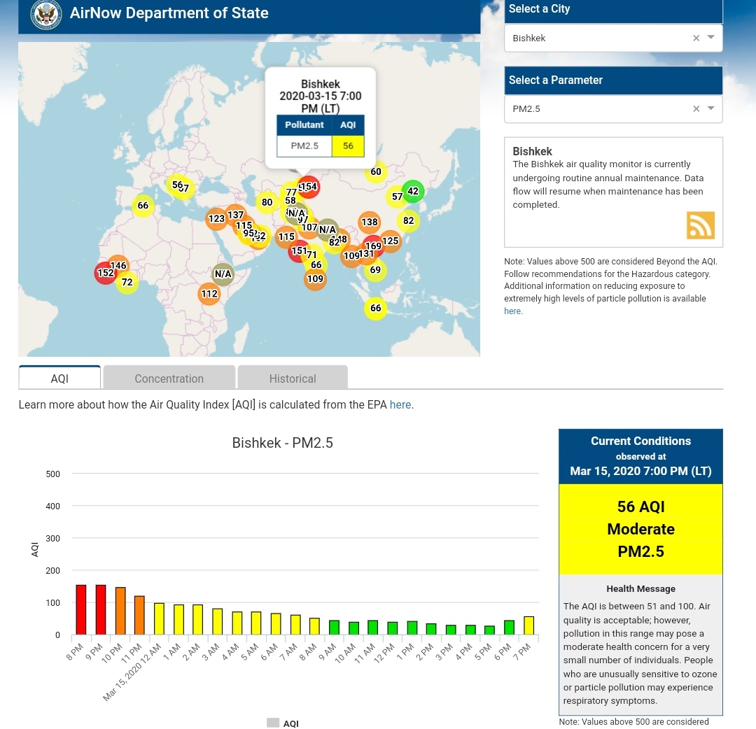 Посольство США в Кыргызстане также установило датчик. Он показывает индекс качества воздуха в режиме онлайн. Информация обновляется ежечасно.
