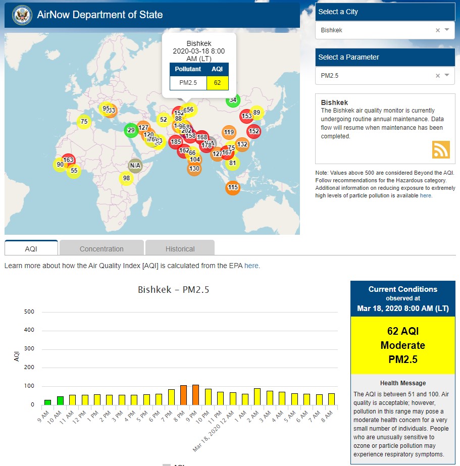 Посольство США в Кыргызстане также установило датчик. Он показывает индекс качества воздуха в режиме онлайн. Информация обновляется ежечасно.