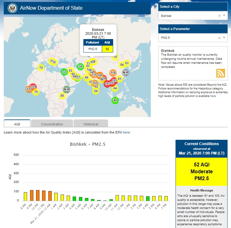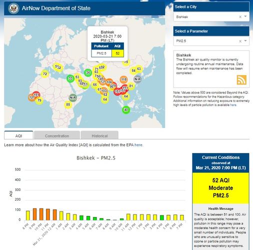 Посольство США в Кыргызстане также установило датчик. Он показывает индекс качества воздуха в режиме онлайн. Информация обновляется ежечасно.