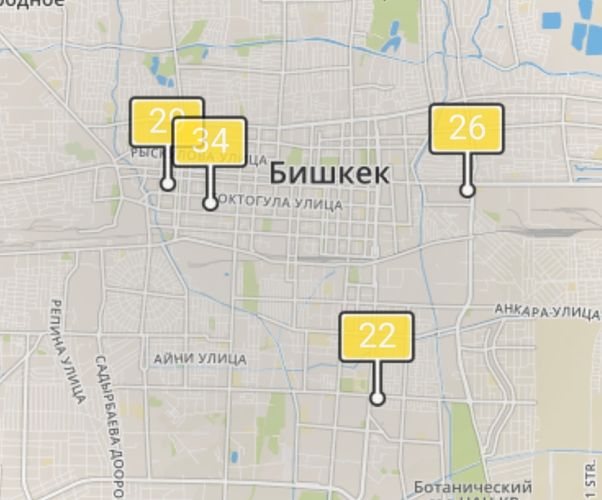 • в районе улиц Бейшеналиевой/Токтогула. Уровень загрязнения превышен в 1,37 раза: PM2.5 среднесуточный — 48 мкг/м³, на момент измерения — 29 мкг/м³;