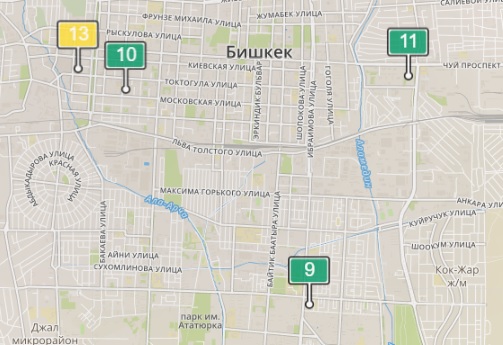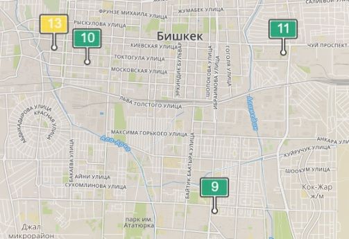 - в районе улиц Бейшеналиевой/Токтогула. Уровень загрязнения не превышен: PM2.5 среднесуточный — 28 мкг/м³, на момент измерения — 13 мкг/м³;