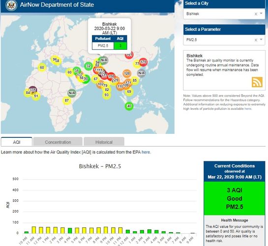 Посольство США в Кыргызстане также установило датчик. Он показывает индекс качества воздуха в режиме онлайн. Информация обновляется ежечасно.