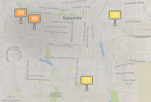 • в районе улиц Бейшеналиевой/Токтогула. Уровень загрязнения не превышен: PM2.5 среднесуточный — 22 мкг/м³, на момент измерения — 50 мкг/м³;