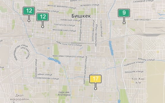 - в районе улиц Бейшеналиевой/Токтогула. Уровень загрязнения не превышен: PM2.5 среднесуточный — 26 мкг/м³, на момент измерения — 12 мкг/м³;