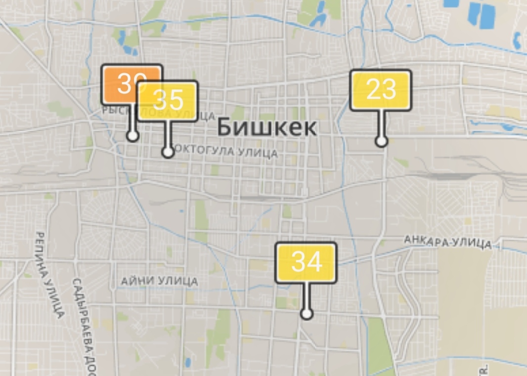 • в районе улиц Бейшеналиевой/Токтогула. Уровень загрязнения превышен незначительно: PM2.5 среднесуточный — 36 мкг/м³, на момент измерения — 39 мкг/м³;