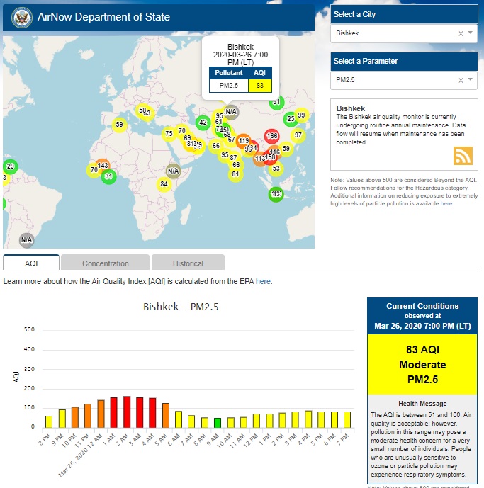 Посольство США в Кыргызстане также установило датчик. Он показывает индекс качества воздуха в режиме онлайн. Информация обновляется ежечасно.