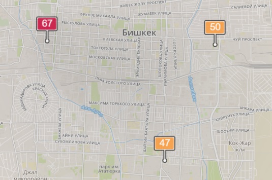 • в районе улиц Бейшеналиевой/Токтогула. Уровень загрязнения превышен в 1,5 раза: PM2.5 среднесуточный — 53 мкг/м³, на момент измерения — 67 мкг/м³;
