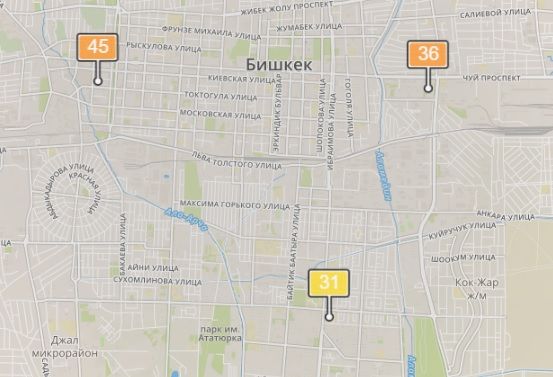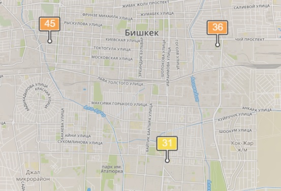 • в районе улиц Бейшеналиевой/Токтогула. Уровень загрязнения превышен в 1,26 раза: PM2.5 среднесуточный — 44 мкг/м³, на момент измерения — 45 мкг/м³;